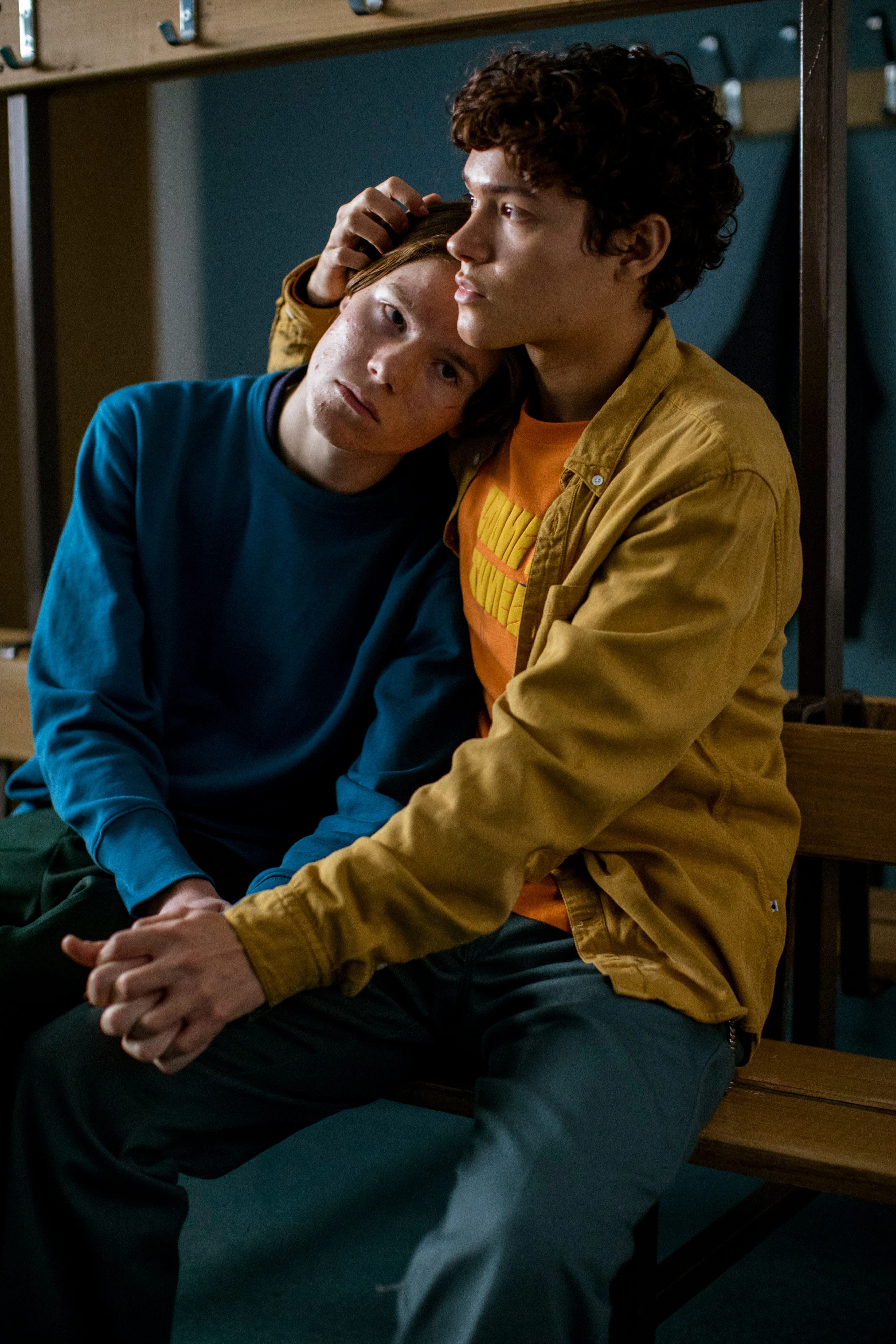 After class, Wilhelm and Simon meet in the locker room. They sit on opposite benches facing each other, and for a moment it is quiet and tense. Then, Wilhelm affectionately nudges Simon's foot, Simon does it back, and the ice is broken. Simon takes Wilhelm's hands, sighs, and asks what they're going to do. He then gets up and sits next to Wilhelm, Wilhelm holds his hand, and Simon rests his head on Wilhelm's shoulder. Wilhelm tells Simon that his mother wants him to issue a denial that upcoming Saturday. When Simon asks if he wants to, Wilhelm says he doesn't want to say anything. Simon says they can't dictate what Wilhelm says, but Wilhelm still seems unsure. Simon says, "We didn't do anything wrong." Wilhelm rests his head on Simon's shoulder and replies, "No. We didn't." They hold each other and agree that they're in this together.